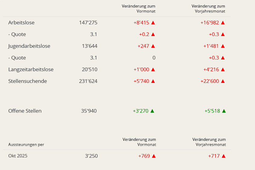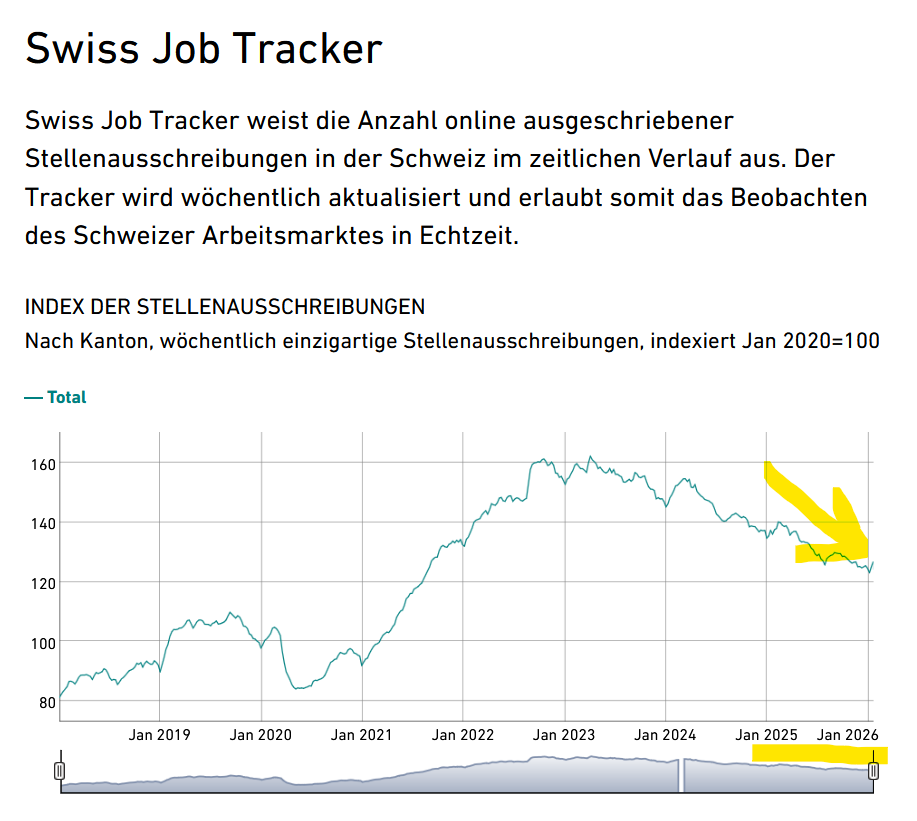 Arbeitsmarkt Schweiz von David Debrot - Donnerstag, 29. Januar 2026, 10:08 Anzahl Antworten: 0 Der Arbeitsmarkt in der Schweiz verzeichnet weiterhin weniger vakante Stellen (Quelle: https://kof.ethz.ch) Ebenso nimmt die Arbeitslosenquote zu (Quelle: https://www.amstat.ch) Dauerlink